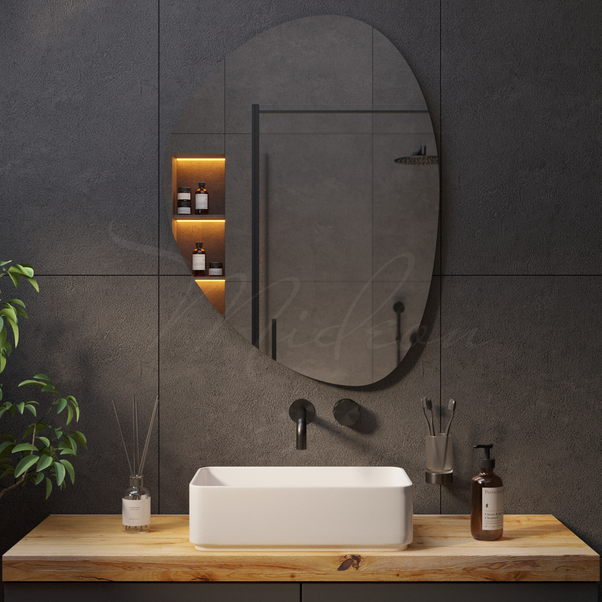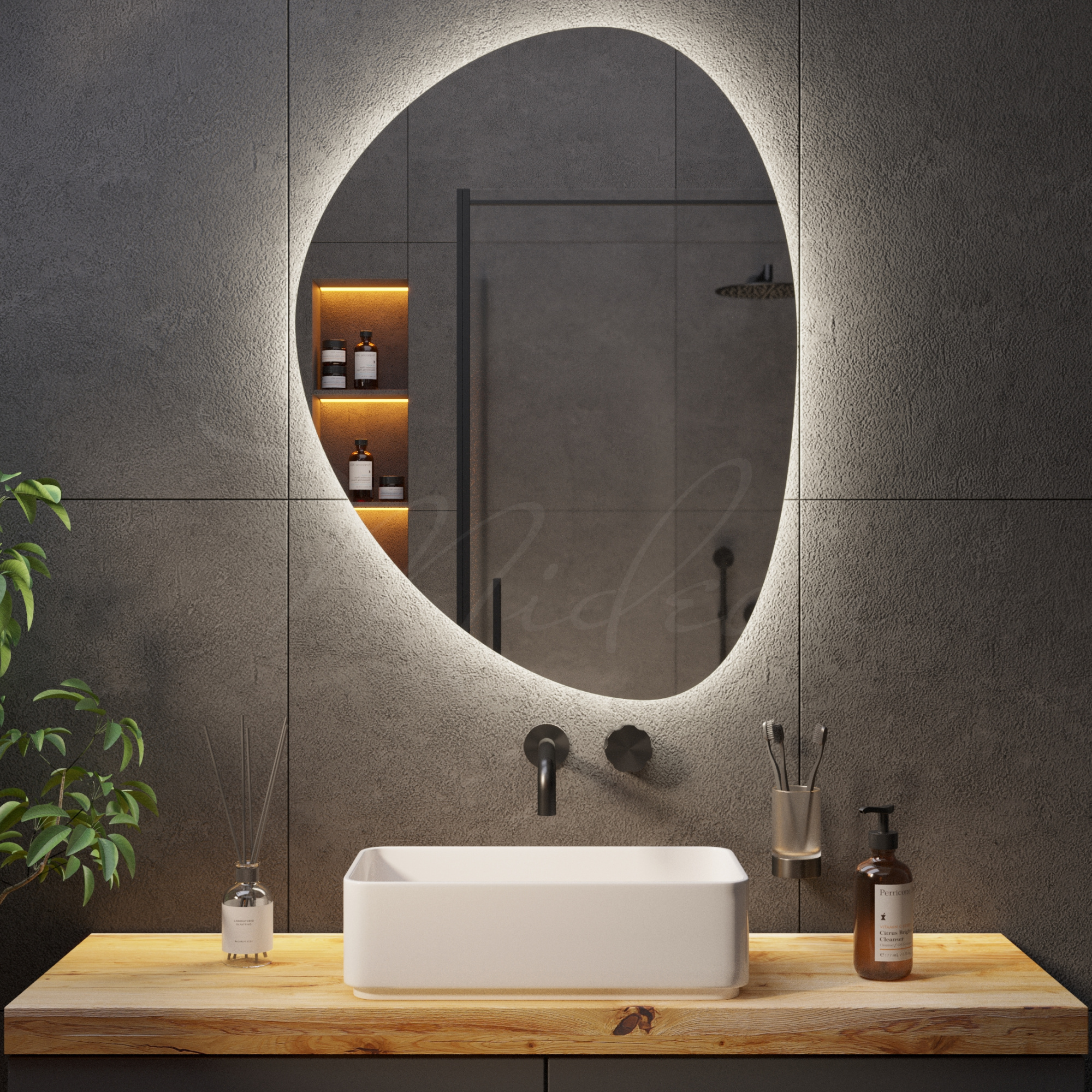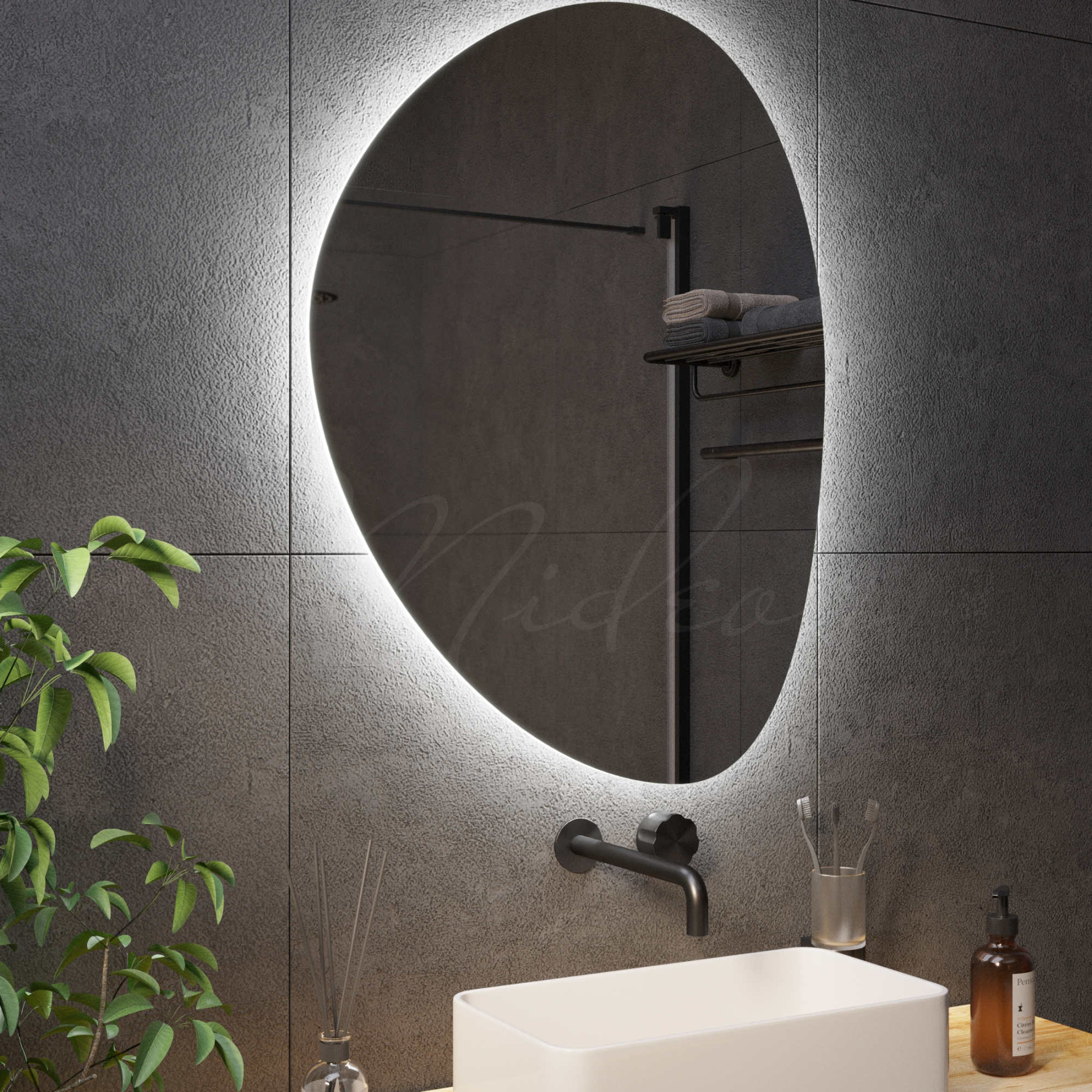 Все наши зеркала с подсветкой необычной формы имеют толщину всего 24 мм благодаря применению современной LED (светодиодной) подсветки, премиальных комплектующих и собственным производственным наработкам.